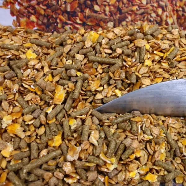 Sudėtis: 30,00 % miežių dribsniai, 20,00 % kukurūzų dribsniai, miežiai, kviečių sėlenos, 8,6 % liucernos žalieji miltai, burokėlių melasos minkštimas, saulėgrąžų ekstrakto miltai, kviečiai, kalcio karbonatas, natrio chloridas, cukrinių runkelių melasa, žlaugtai, 0,8 % linų sėmenų ekstrakto miltai, saulėgrąžų aliejus, monokalcio fosfatas.