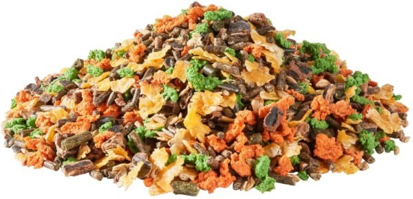 SUDĖTIS: kviečių sėlenos, žalios liucernos miltai, kukurūzų dribsniai 11%, saulėgrąžų miltai, miežiai, palmių branduolių miltai, miežių dribsniai 5%, kviečiai, avižos, avižiniai dribsniai 4%, karobai, skaldyti kukurūzai, raudoni ekstruziniai kukurūzai, žali ekstruziniai kukurūzai, cukrinių runkelių melasa, saulėgrąžų sėklos, saulėgrąžų aliejus, natrio chloridas, kalcio karbonatas.