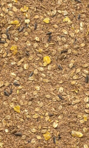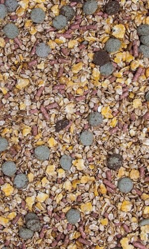 Sudėtis: kukurūzų dribsniai, miežių dribsniai, kviečių sėlenos, speltos lukštai, liucernos miltai, kviečiai, melasa, kalcio karbonatas, sėmenų aliejus, liucernos šienas, natrio chloridas, miežiai, magnio oksidas, alaus grūdai, alaus mielės, monokalcio fosfatas.
