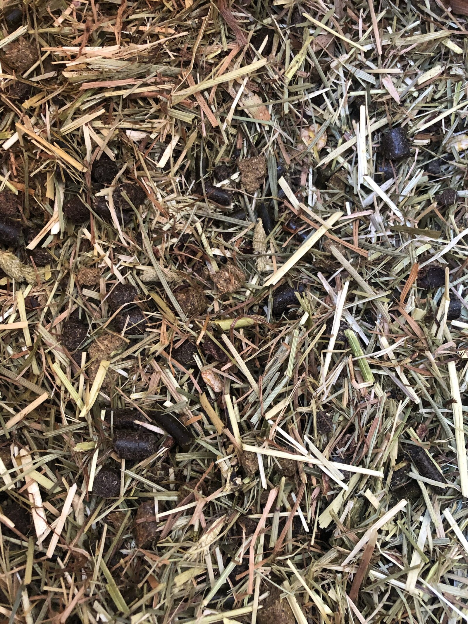 Sudėtis: saulėgrąžų ekstrakcijos miltai, liucerna, saulėgrąžų lukštai (17,6 %), motiejukų žolė, linų sėmenų lukštai (6,6 %), sojų pupelių lukštai, saldžiavaisio pupmedžio miltai, linų sėmenų aliejus, pievų žolės ir žolelių dribsniai, obuolių išspaudos, cikorijų minkštimas, linų sėmenų išspaudos, vynuogių kauliukų miltai, kiaulpienių lapai.