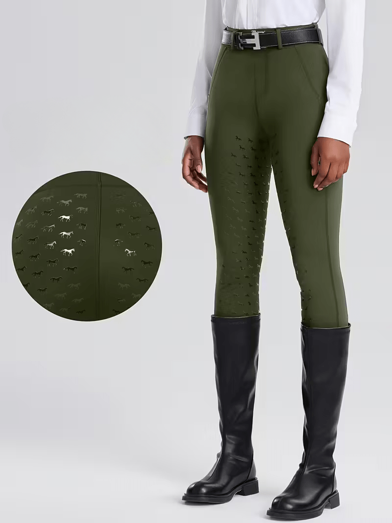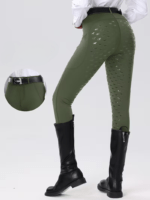Moteriškos aukšto liemens jojimo kelnės su sėdmenų pakėlimo efektu – elastingos, priglundančios, su silikonine neslystančia sėdimąja dalimi.
